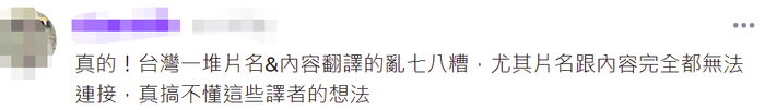 也有网友透露,台湾有不少影片片名、内容翻译得乱七八糟,搞不懂这些译者的想法。↓