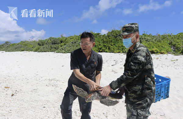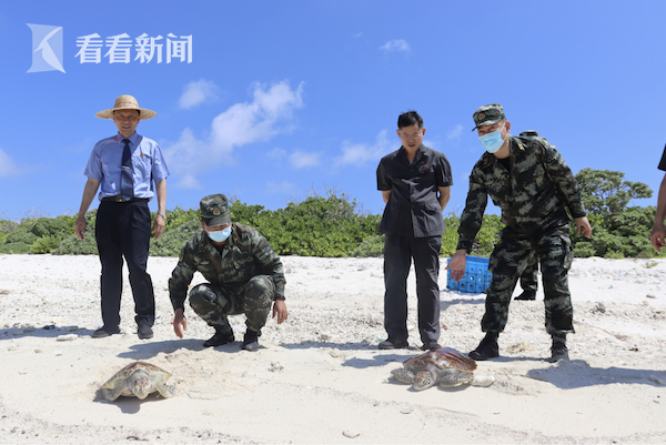 4 月26 日,三沙海警局联合三沙市三沙群岛人民法院、三沙市人民检察院和三沙市北岛海龟保护站,在三沙市西沙群岛北岛组织开展野生海洋动物放归大自然活动,两只绿海龟被放归大海。