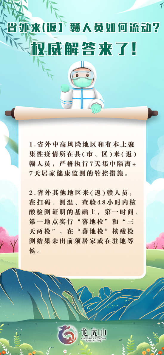 二、省外其他低风险地区来赣返赣人员,需扫码、测温、查验48小时核酸检测阴性证明,并在第一时间、第一地点实行“落地检”和“三天两检”,“落地检”核酸检测结果未出前须居家或在驻地等候,不得参加聚集性活动。本省有本地疫情地区间人员的流动管理参照执行。(注意:1、进入景区时需主动提供来赣之前的48小时核酸检测报告和来赣之后的24小时核酸检测报告证明。2、请关注江西疾控《江西省疫情防控风险提示》,省外其他低风险地区为《江西省疫情防控风险提示》当中没有提到的县区。)
