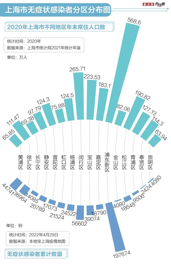 上海市共有16个行政区,其中,浦东新区面积最大、人口最多。从数量上看,也成为本轮疫情最严重的区域。浦东新区在3月10日报告本区3月首例本土确诊病例,新增本土确诊病例数在3月30日迎来第一个小高峰。目前,浦东新区既是本土确诊病例数最多的地区,也是无症状感染者累计数量最多的地区。