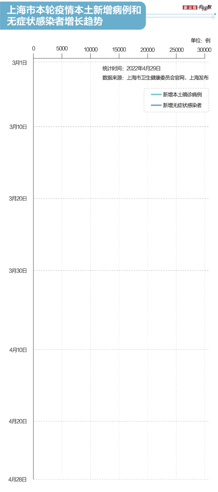 但是,比这更令人担忧的,是高速跃进的无症状感染者数量。3月24日后,上海市新增无症状感染者规模已达到数千人。在4月4日至4月26日,上海每日新增的无症状感染者数量,曾连续二十余日达到万数。