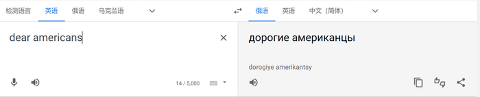 不过,输入“dear ukrainians(亲爱的乌克兰人)”“dear americans(亲爱的美国人)”时,谷歌翻译没有上述提示。↓