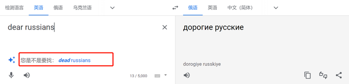 又是谷歌翻译!输入“亲爱的俄罗斯人”提示是否要找“死去的俄罗斯人”,被俄媒发现了(环球网)