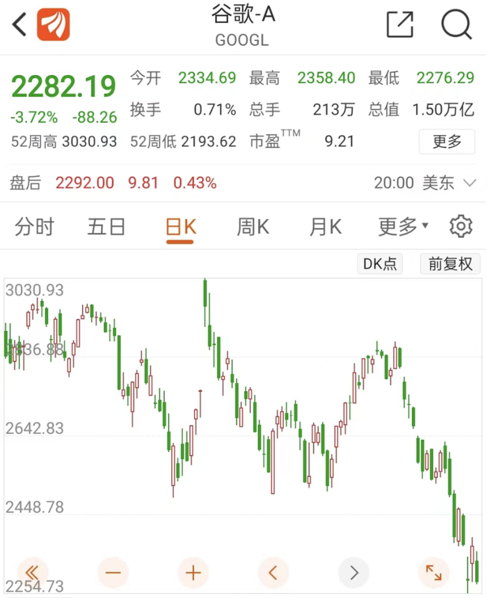 在财报不及预期的影响下,谷歌股价持续走弱,截至最新收盘,其股价跌至2282.19美元,相比今年2月的高点已跌去24.7%,总市值累计蒸发高达4926亿美元(约合人民币32556亿元)