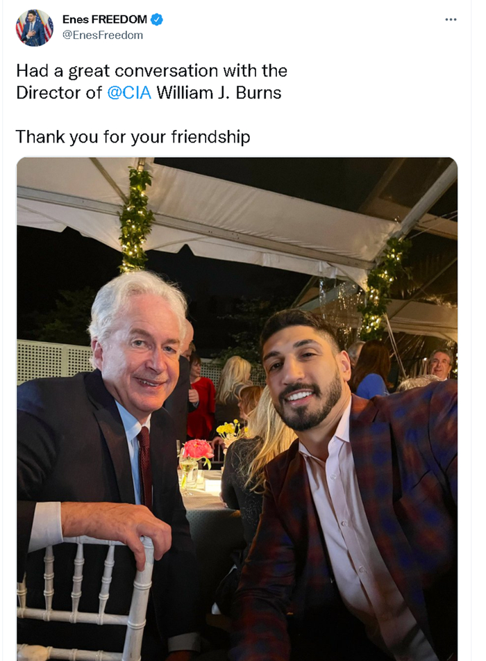 近日,坎特在自己社交账号上新发布的一个贴文,或许解释了他为何更关心攻击中国而不是打篮球了。因为他于北京时间4月30日晚9时发布的这个贴文,居然是他和美国政府的特务头子、美中央情报局(CIA)的局长伯恩斯的合影。