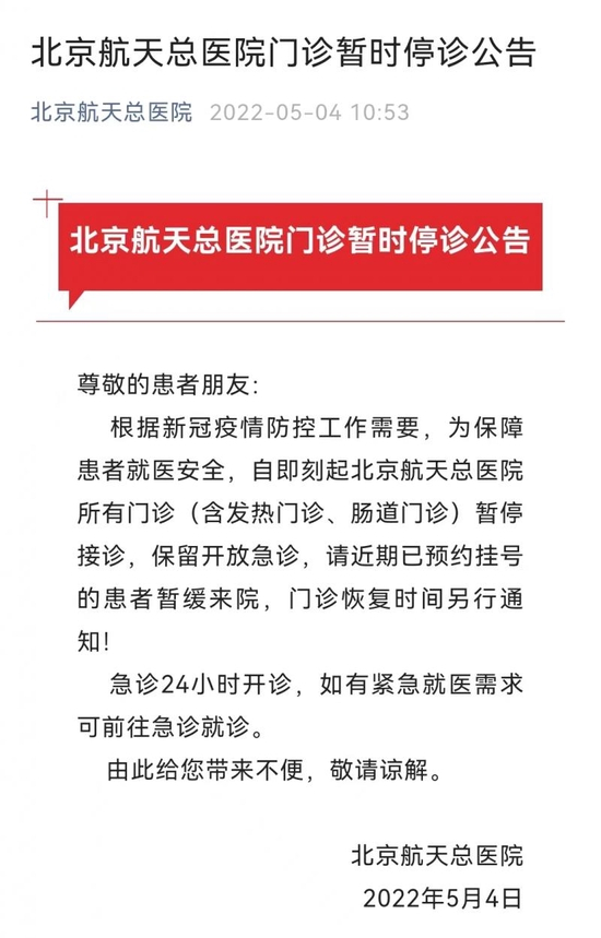 5月4日,北京航天总医院发布门诊暂时停诊公告,根据新冠疫情防控工作需要,为保障患者就医安全,自即刻起北京航天总医院所有门诊(含发热门诊、肠道门诊)暂停接诊,保留开放急诊,请近期已预约挂号的患者暂缓来院,门诊恢复时间另行通知。急诊24小时开诊,如有紧急就医需求可前往急诊就诊。