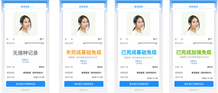四是疫苗“导出或打印接种凭证”功能入口更明显。升级后“导出或打印接种凭证”按钮将设置在接种记录首屏底部,不随屏幕滚动移动,方便用户快速触达、使用服务。接种凭证中包含疫苗名称、剂次、接种日期、疫苗批号、生产企业、接种单位等信息。