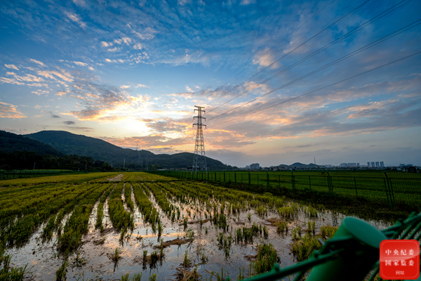 海南省陵水县椰林镇三父园村附近,夕阳西下,大地仿佛披上了一张金黄色的薄纱,天也被映衬得湛蓝通透,远处的夕阳照射在刚被收割完的作物上,似乎在预示着春的离去和夏的到来。(海南省陵水黎族自治县纪委监委 王博欧 摄)