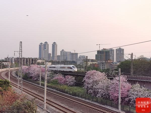 春末,广西壮族自治区柳州市紫荆花正值盛开之际,一辆“和谐号”列车穿梭花海,在铁轨上呼啸而过。(广西壮族自治区柳州市柳南区纪委监委 陆曦 摄)