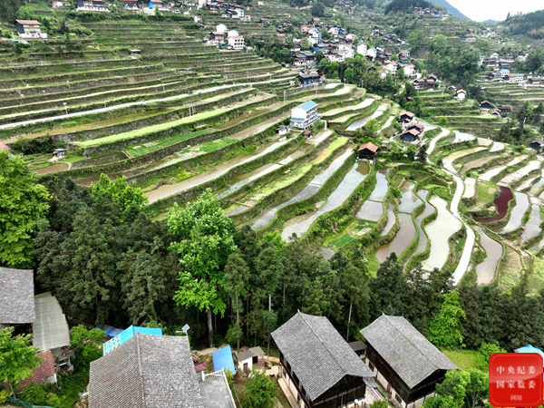 初夏的贵州省锦屏县固本乡东庄梯田水润灵动,波光粼粼,梯田、民居、青山交相辉映,构成一首美丽的田园交响曲。(贵州省锦屏县纪委监委 刘光英 摄)