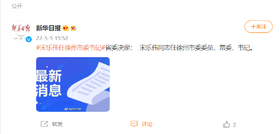 今日消息,江苏省委决定:宋乐伟同志任徐州市委委员、常委、书记。