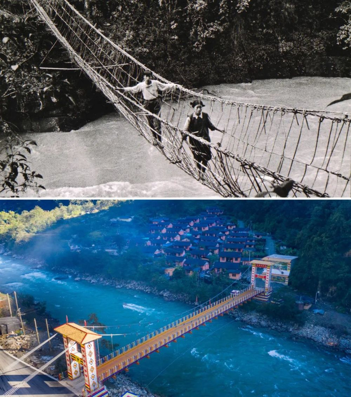 上图 :独龙族群众通过藤篾桥,这样的桥一直沿用到独龙江索改桥和公路桥通行以后(资料照片);下图:独龙江乡2020年10月中旬建成通车的白来感恩大桥 胡超摄 / 本刊