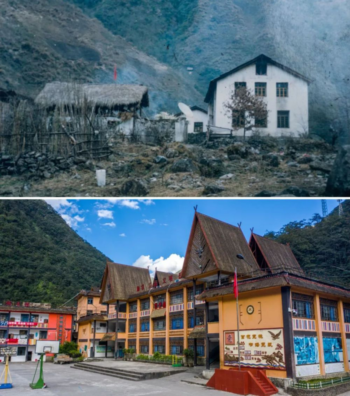 上图:曾经的独龙江乡中心学校(资料照片);下图:崭新的独龙江中心学校教学楼(2020年10月28日摄) 胡超摄 / 本刊