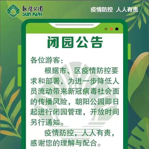 朝阳公园即日起进行封闭管理,开放时间另行通知。