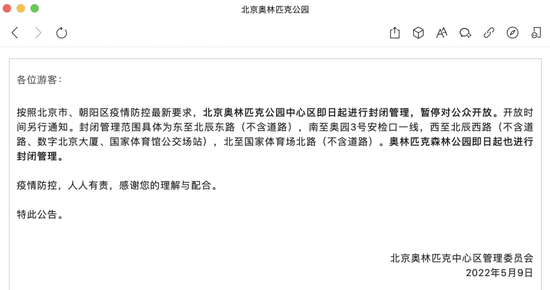 5月9日早上,北京朝阳公园、温榆河公园、奥林匹克森林公园、奥林匹克公园中心区、将府公园等宣布即日起闭园管理,开放时间另行通知。
