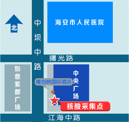 1.被赋黄码人员应立即向所在村居(社区)报备,并按规定到指定采样点(海安市中坝中路99号中央广场西南侧,见附图)进行核酸检测,相关费用自行承担。解码程序:“黄码”人员持核酸检测阴性证明向所在村居(社区)提交转码申请,经严格审核后规范转码。