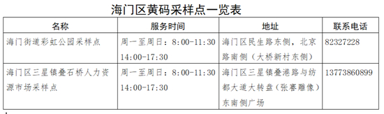 3.行程码带星号人员做好个人防护,就近在我市设立的星号人员采样点采样。星号人员采样点分别是:奥体中心临时采样点;城南街道社区卫生服务中心采样点、城北街道社区卫生服务中心袁桥分中心采样点、东陈镇卫生院采样点、丁堰镇卫生院采样点、市第四人民医院(白蒲镇卫生院)采样点、下原镇卫生院采样点、九华镇卫生院采样点、市第三人民医院(石庄镇卫生院)采样点、长江镇临时采样点、江安镇卫生院采样点、搬经镇卫生院采样点、吴窑镇卫生院采样点、磨头镇卫生院采样点星号专用窗口。