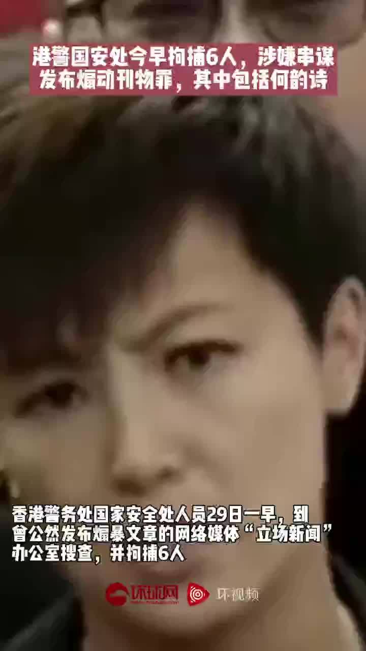 [环球网报道 记者 康博浩]综合“东网”和“星岛网”等港媒消息,香港警务处国家安全处人员于今天(29日)拘捕曾公然发布煽暴文章的网络媒体“立场新闻”6名高层或前高层人员,他们涉嫌违反《刑事罪行条例》第9及10条串谋发布煽动刊物罪,并搜查被拘捕人士的处所。报道提到,被拘捕的6人中包括“港独”艺人何韵诗。