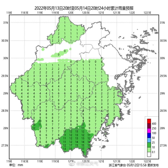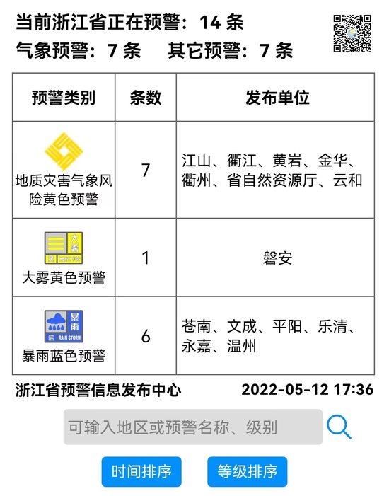 浙江省自然资源厅5月12日16时44分发布地质灾害气象风险黄色预警:05月12日18时至05月13日18时,温州市(鹿城区、瓯海区、永嘉县、文成县、泰顺县、瑞安市、乐清市)、衢州市(衢江区、江山市)、台州市(黄岩区、仙居县、温岭市、玉环市)、丽水市(莲都区、青田县、缙云县、遂昌县、云和县、庆元县、景宁畲族自治县、龙泉市)等部分地区地质灾害气象风险较高(黄色预警)。
