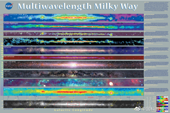 图片为银河系各个波段的照片,自上而下能量逐渐增加,从毫米波到伽马射线