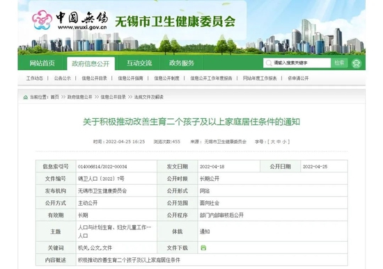 4月25日,江苏省无锡市卫生健康委员会发布《关于积极推动改善生育二个孩子及以上家庭居住条件的通知》(简称《通知》)。《通知》明确,生育二个孩子及以上的无锡户籍居民家庭,可在限购区域新增购买一套商品住房。