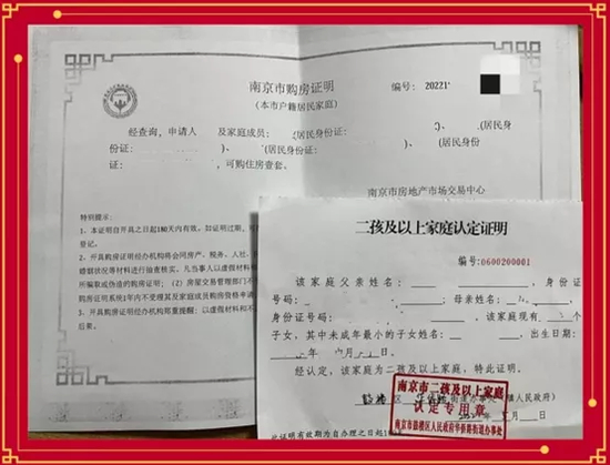 开具《南京市二孩及以上家庭认定证明》次日起,可到全市各房产交易与不动产登记大厅申请开具购房证明,享受新增购买一套商品住房支持政策。