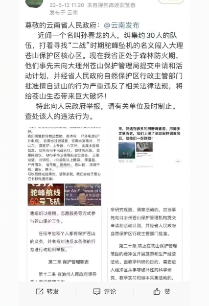 5月12日,一位网友曾在社交平台发布举报消息称,在云南省正处于森林防火期之时,一个名叫孙春龙的人集合了约30人的队伍,要以寻找驼峰坠机的名义进入大理苍山保护区核心区,违反了相关法律法规,希望有关单位及时制止。