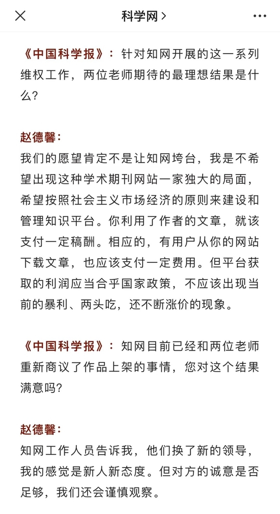 中国科学报从赵德馨教授处获悉,知网于12日下午登门道歉,表达了重新上架他与妻子周秀鸾论文作品的意愿。
