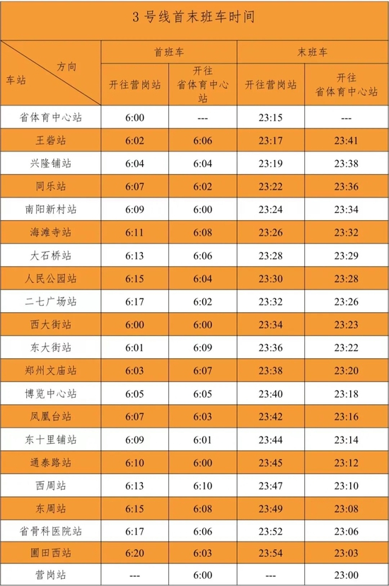 郑州地铁3号线全线恢复运营,恢复运营后3号线首末班车时间表详见下图: