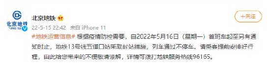 根据疫情防控需要,自2022年5月16日(星期一)首班车起至另有通知时止,地铁13号线五道口站采取封站措施,列车通过不停车。请乘客提前安排好行程,由此给您带来的不便敬请谅解,详情可拨打地铁服务热线96165。