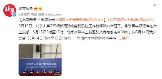 5月15日,北京市第335场新冠肺炎疫情防控工作新闻发布会召开。北京青年报记者在会上获悉,5月15日0时至15时,北京新增本土新冠肺炎病毒感染者38例。自5月14日发布会后(5月14日15时至15日15时),新增本土新冠肺炎病毒感染者55例。均已转至定点医院隔离治疗,相关风险点位及人员已管控落位。在会上,海淀区和丰台区公布了新增病例的活动轨迹及风险点位。