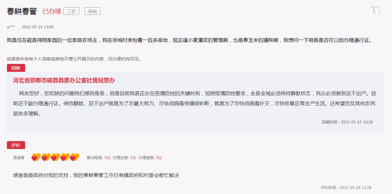 上述网民5月16日在留言下方评价称,“感谢县委政府对我的支持,我的春耕春管工作已有镇政府和村委会帮忙解决。”