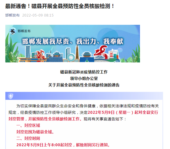 据“邯郸发布”公众号5月9日发布信息显示,磁县自2022年5月9日起对全县实行封控管理,开展预防性全员核酸检测工作,封控范围为磁县全域所有居民(包括外地在磁人员),封控时间自2022年5月9日上午8:00起,解除时间另行通知。通告中强调,“封控期间,全县保持静默状态,做到外不进、里不出、内不动”。