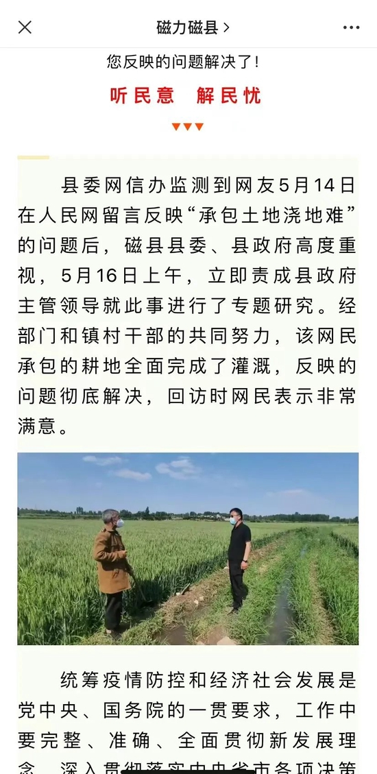 17日凌晨3时许,河北磁县县委宣传部微信号“磁力磁县”发布消息称,磁县县委网信办监测到网友5月14日在人民网留言反映“承包土地浇地难”的问题后,磁县县委、县政府高度重视,5月16日上午,立即责成县政府主管领导就此事进行了专题研究。经部门和镇村干部的共同努力,该网民承包的耕地全面完成了灌溉,反映的问题彻底解决,回访时网民表示非常满意。