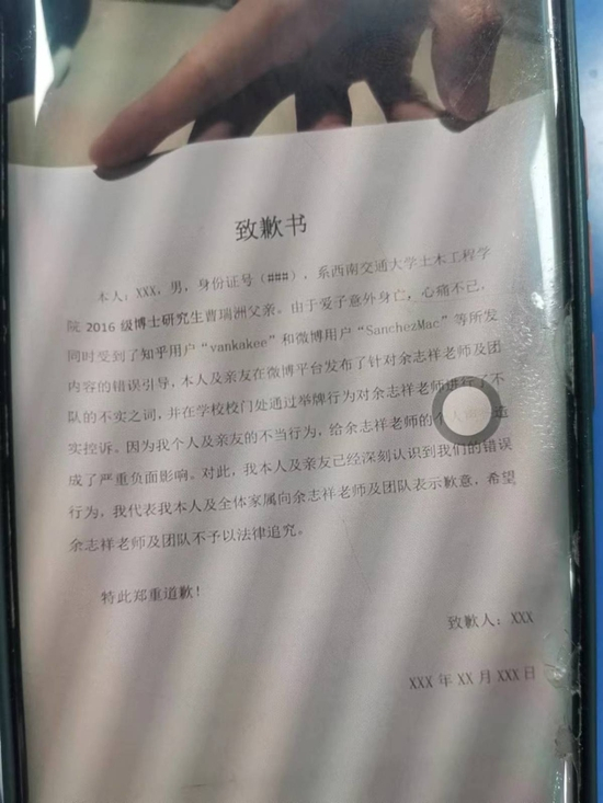 在骆女士提供的格式版“致歉书”中显示,本人xxx系西南交通大学土木工程学院2016级博士研究生曹瑞洲父亲,受到……错误引导,发布针对余志祥老师及团队的不实之词……我代表我本人及全体家属向余志祥老师及团队表示歉意,希望余志祥老师及其团队不予以法律追究。