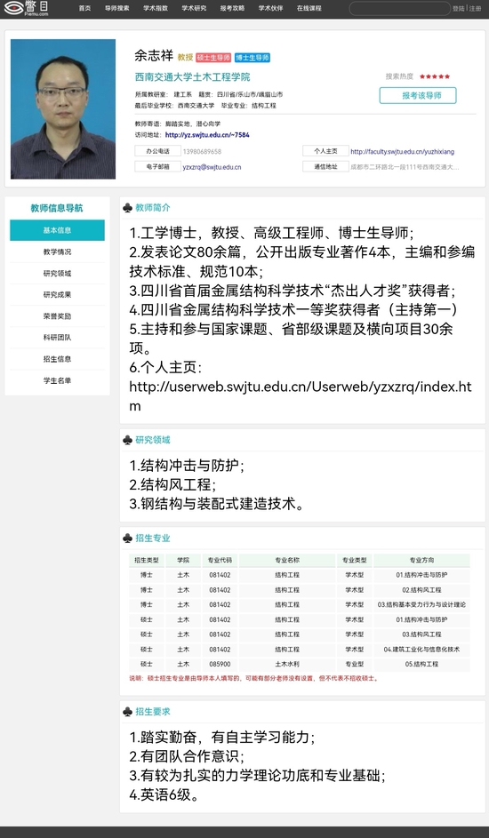 根据西南交通大学官网信息,余志祥为西南交通大学土木工程学院硕博导师,是工学博士,教授、高级工程师、博士生导师;发表论文80余篇,公开出版专业著作4本,主编和参编技术标准、规范10本;四川省首届金属结构科学技术“杰出人才奖”获得者;四川省金属结构科学技术一等奖获得者(主持第一)主持和参与国家课题、省部级课题及横向项目30余项。研究领域为结构冲击与防护、结构风工程、钢结构与装配式建造技术。