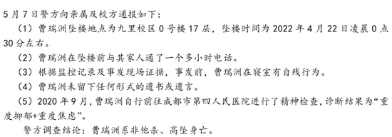 5月中旬,一份《关于西南交通大学博士生曹瑞洲于2022年4月22日坠亡事件的情况说明》在网络流传。
