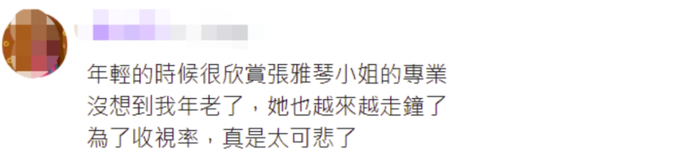 有网友认为张雅琴是为收视率在博眼球:“年轻的时候很欣赏张雅琴小姐的专业,没想到我年老了,她也越来越走钟(出了故障、失了神、着了魔)了,为了收视率,真是太可悲了。”↓