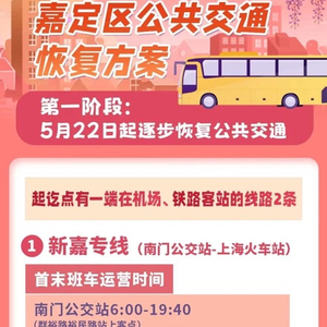 新嘉专线(南门公交站-上海火车站),首末班车运营时间:南门公交站自6:00至19:40;上海火车站7:00至21:00,班次间隔60分钟。