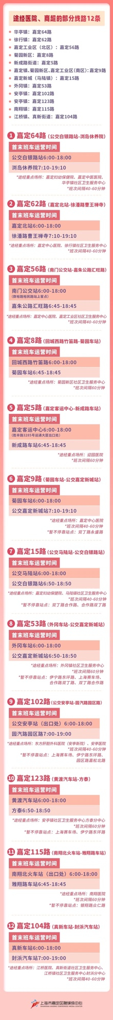 嘉定新城(马陆镇)—嘉定15路;安亭镇—嘉定102路、嘉定123路;南翔镇—嘉定115路;江桥镇、真新街道—嘉定104路;徐行镇—嘉定62路;外冈镇—嘉定53路;华亭镇—嘉定64路;嘉定镇街道、菊园新区、嘉定工业区(南区)—嘉定9路;新成路街道—嘉定5路;嘉定工业区(北区)—嘉定56路;菊园新区—嘉定8路。首末班车运营时间自6:00至18:00,班次间隔40-60分钟。