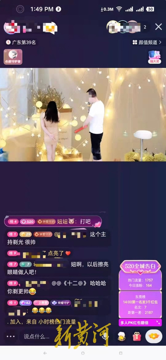午夜12点,一位名为“烟店XX”的女主播上线了。直播间刻意没有开灯,显得黑漆漆一片,女主播用暧昧的口吻表示,接下来要给直播间的粉丝”走活动”,只要有人能送出两个烟花(1烟花=208快币,10快币=1元),就能让大家“开心”。“台上做戏,台下做人。主播平时开播给大家唱歌,连情感麦。晚上这个点才能给大家走活动,让大家开心。活动绝对能达到你想要的效果。”这位女主播声称。不到五分钟时间,直播间就涌入了几百人。当下面有留言问到“什么活动”时,主播表示“那个字不能说,说了要封号”。在主播的一再撩拨下,终于有粉丝送出两个烟花,此时主播表示“大家把眼睛睁大了,一闪就过哦。”在该主播“3、2、1”的倒数下,直播间灯光变亮,镜头疑似对准大腿内侧数秒钟后,整场直播迅速结束。