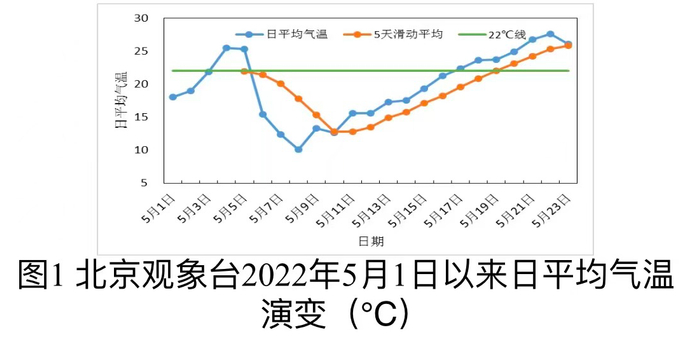 由图可以看出,根据2022年5月以来日平均气温实况计算,自5月19日起已连续5天滑动平均气温序列大于或等于22℃,其所对应的日平均气温序列中第一个大于或等于22℃的日期为5月17日(22.3℃),据此可判断2022年入夏日期为5月17日。
