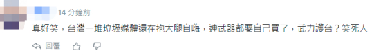 还有网友嘲讽,“真好笑,台湾一堆媒体还在抱大腿自嗨,连武器都要自己买了,武力护台?笑死人”。↓