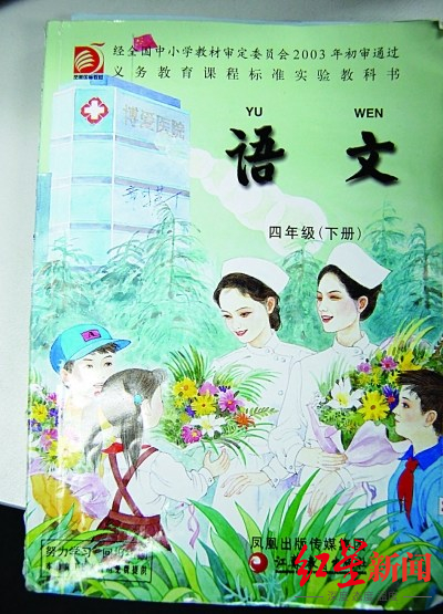 该课本封面是几个孩子给护士献花的场景,背景是一栋印着红十字的大楼,而楼上方写着“博爱医院”四个大字,而“博爱医院”是一家治疗妇科、男科疾病的民营医疗机构。这本语文教材封面上端标示:经全国中小学教材审定委员会2003年初审通过,是义务教育课程标准实验教科书。
