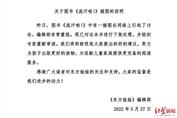 同时有网友发现,江苏凤凰少年儿童出版社出版的一本《流汗啦!》绘本,也出现了卡通男孩拉着女生胳膊舔汗的图案,画面呈现的感觉让人不适。5月27日,《东方娃娃》编辑部发布说明称:昨日,图书《流汗啦!》中有一插图在网络上引起了讨论,编辑部非常重视。现已对这本书进行下架处理,并组织专家重新审读。