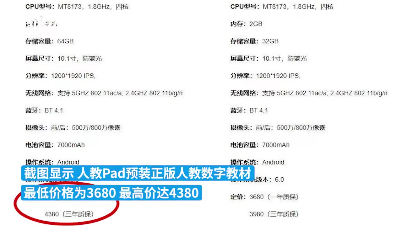 @中新经纬 消息,人教Pad定价超4000元引关注,官网显示,人教Pad有两种配置,价格区间在3680元—4380元之间。