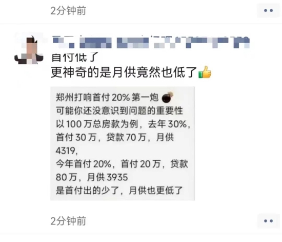 某项目销售负责人告诉记者,这个消息最早是中国银行郑州支行释放的,但是没有明确的文件,只是口头的传达,中行会和合作项目提供少量20%首付的名额,试探市场情绪,但是传递到渠道中介的时候,就已经变成“确定首付20%”,一发不可收拾。