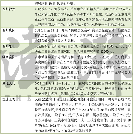拿江苏连云港来说,连云港市住建局于5月17日发布《连云港市市区支持居民刚性和改善性住房消费实施细则》,2022年5月18日至2022年6月30日期间内,对市区(不含赣榆区)居民购买新建的家庭唯一住房和第二套改善性住房予以补贴。其中,对购买的系家庭唯一住房90平方米以下(含90平方米)和90平方米以上的分别按购房款的1%和1.5%进行补贴;对购买的系第二套改善型住房90平方米以下(含90平方米)和90平方米以上的分别按购房款的1%和2%进行补贴。(>>详情:连云港:购买首套或二套新房给予补贴,最高为购房款的2%)