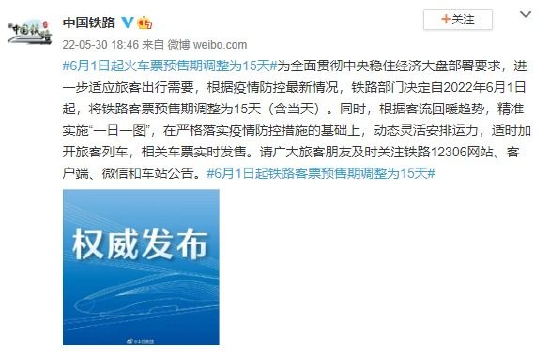 为全面贯彻中央稳住经济大盘部署要求,进一步适应旅客出行需要,根据疫情防控最新情况,铁路部门决定自2022年6月1日起,将铁路客票预售期调整为15天(含当天)。同时,根据客流回暖趋势,精准实施“一日一图”,在严格落实疫情防控措施的基础上,动态灵活安排运力,适时加开旅客列车,相关车票实时发售。请广大旅客朋友及时关注铁路12306网站、客户端、微信和车站公告。#6月1日起铁路客票预售期调整为15天#