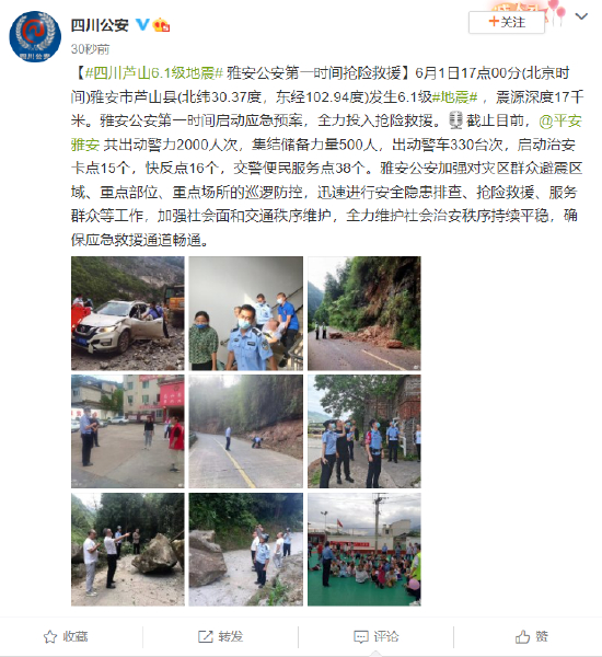 [四川芦山6.1级地震 雅安公安第一时间抢险救援]6月1日17点00分(北京时间)雅安市芦山县(北纬30.37度,东经102.94度)发生6.1级#地震# ,震源深度17千米。雅安公安第一时间启动应急预案,全力投入抢险救援。